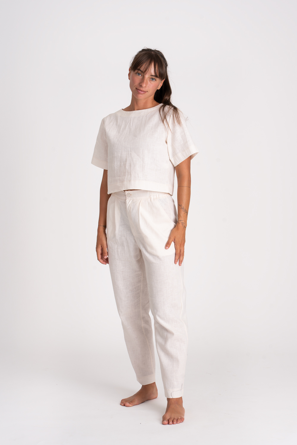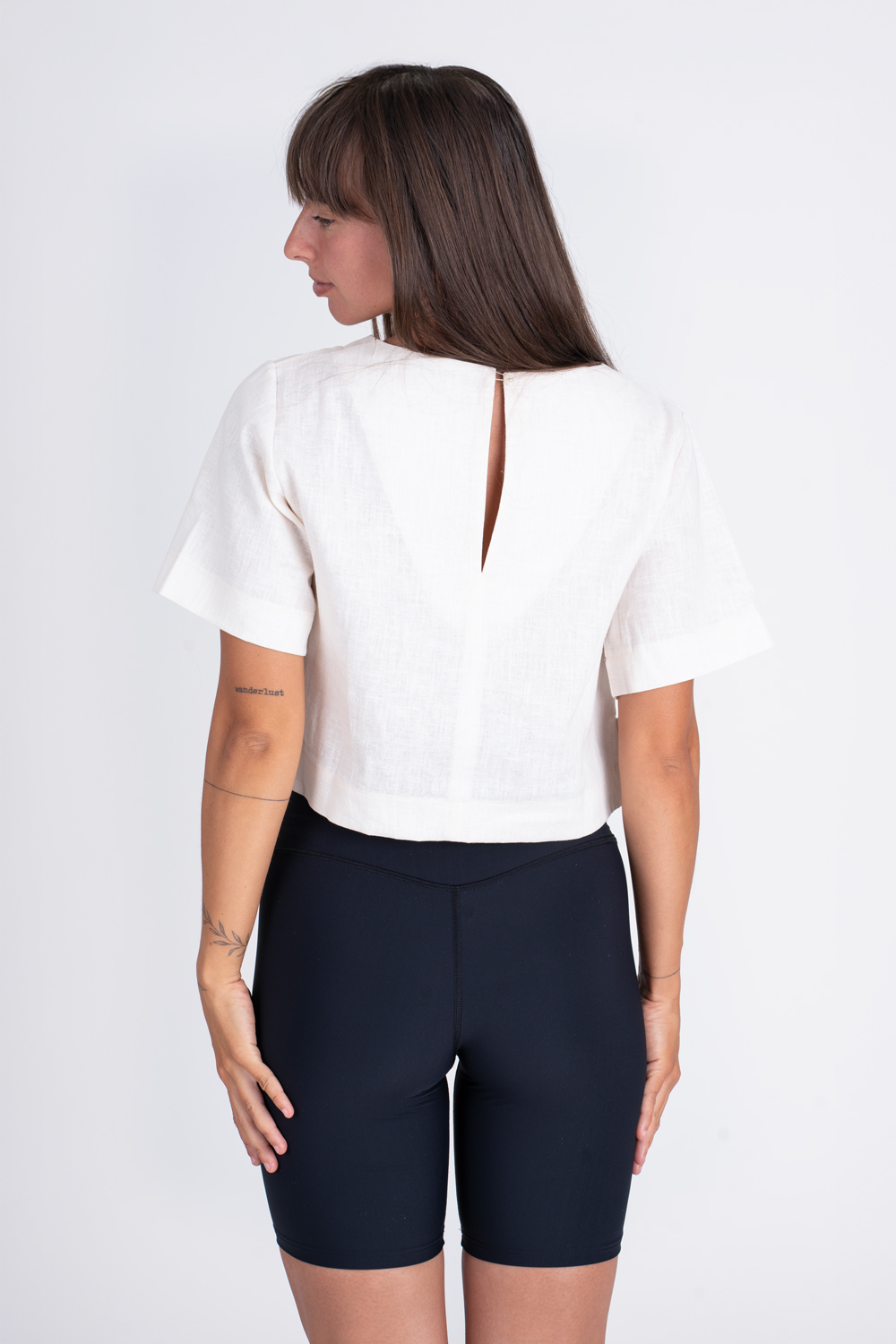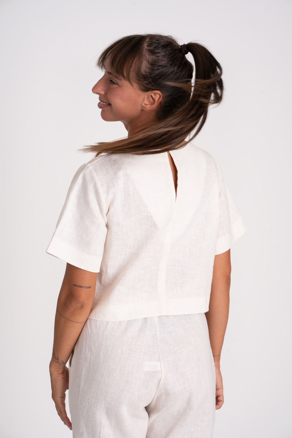 Letné ľanové tričko, ktoré si zamilujete. Voľný ľahko cropnutý strih s jemne spustenými rukávmi pôsobí uvoľnene a krásne žensky. Prírodný materiál - ľan je vzdušný, prirodzene ochladzuje a je ako stvorený na horúce dni. Zapínanie na chrbte pridáva štýlový detail. Perfektný kúsok na letný deň.
